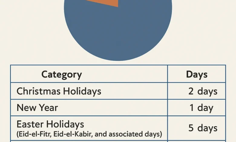 | Muslim Holidays | 5 (Eid-el-Fitr, Eid-el-Kabir, and associated days) |